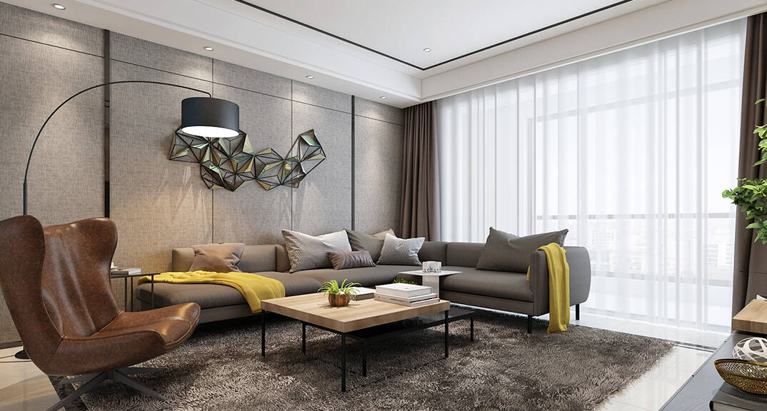 客廳體現(xiàn)了主人的品味,地位,也是交友娛樂的場(chǎng)合,影視墻凹凸線條的護(hù)墻板很好的隱藏了孝親房的門讓整個(gè)空間融為一體。