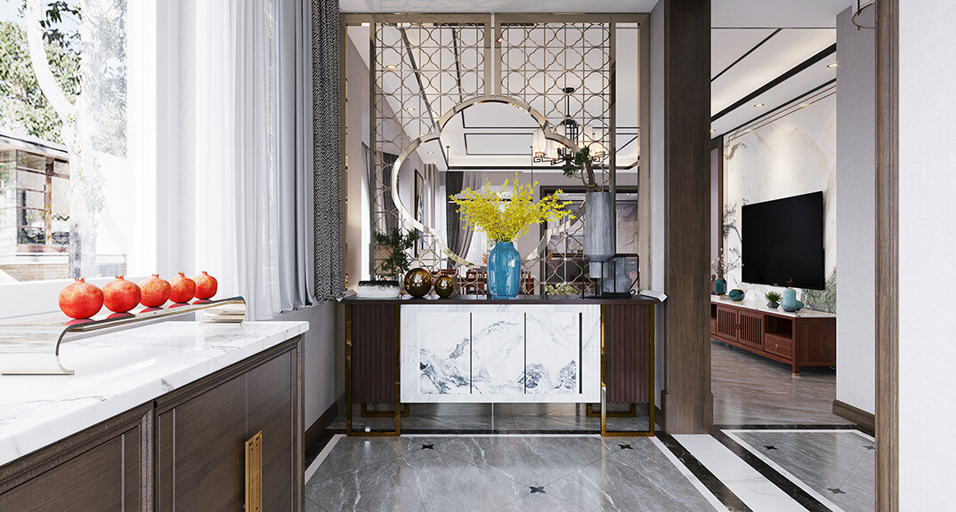 紫荊閣150㎡別墅下疊入戶玄關新中式風格裝修案例效果圖