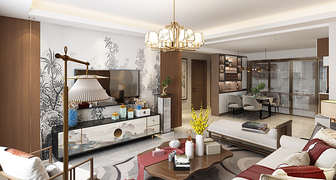 天寧首府128㎡三室兩廳客廳新中式風(fēng)格裝修案例效果圖