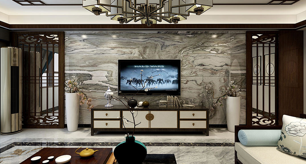 依云四季138㎡四室兩廳客廳電視新中式風格裝修案例效果圖