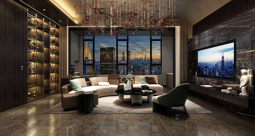 海信積米灣145m2三室兩廳客廳輕奢風(fēng)格裝修案例效果圖