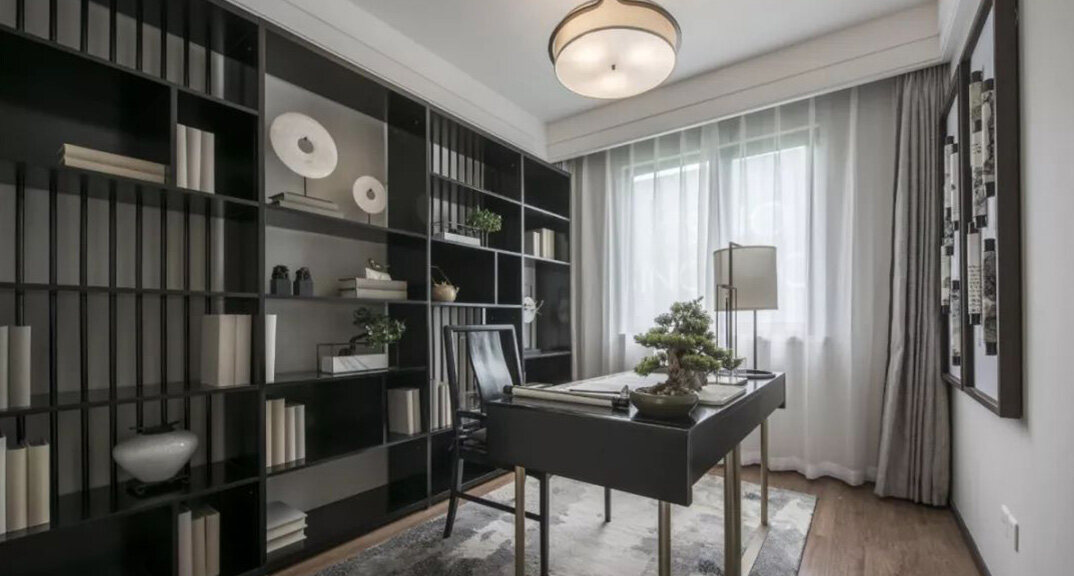 悅湖灣135㎡三室兩廳書房新中式風(fēng)格裝修案例效果圖