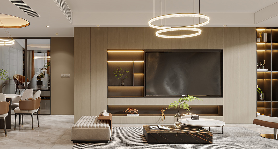 整體淺色為主,適當?shù)脑黾由实膹埩?,客餐廳墻面采用舒適的暖黃色搭配,入戶的鞋帽柜滿足日常使用,由于南次臥的門口影響了電視墻的整體性,在后期材料的選擇和造型的搭配上利用中式風格的對稱特點做電視墻的處理,產(chǎn)生隱形門的效果。也更好的調(diào)和了電視墻的居中視距。