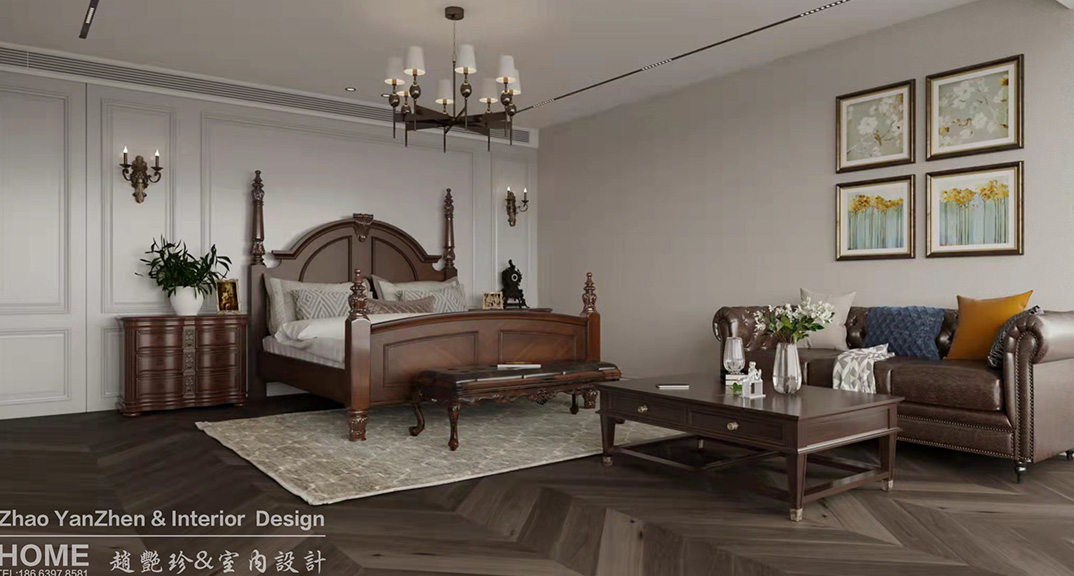 璞麗豪庭287㎡疊拼上疊二樓主臥美式輕奢風(fēng)格裝修案例效果圖