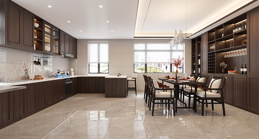 河山別墅300㎡別墅餐廳廚房新中式風(fēng)格裝修案例效果圖