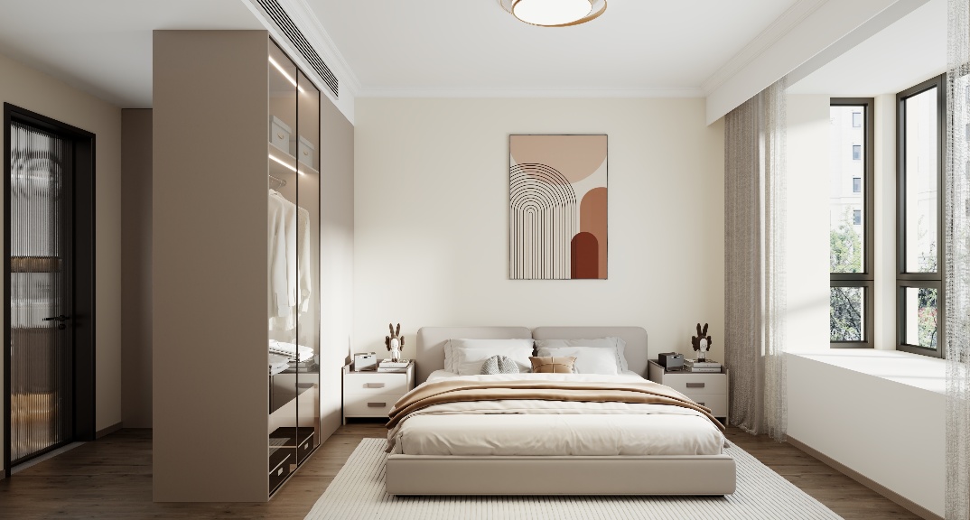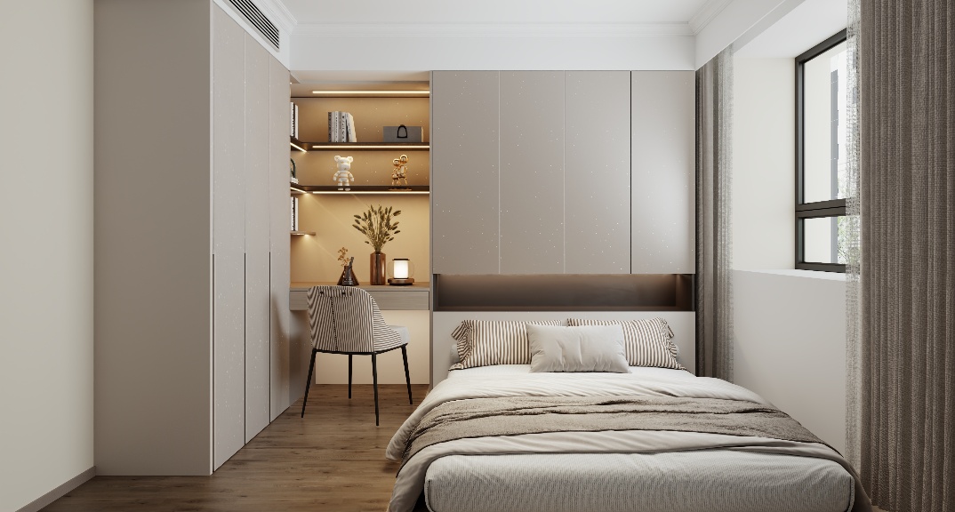 餐廳用六人桌+倒臺(tái)一體既滿足了多人就餐問(wèn)題又能實(shí)現(xiàn)冰吧等品質(zhì)的提升,餐廳簡(jiǎn)潔時(shí)尚,槍灰色色的線性燈吸引著眼球,與金屬餐廳酒柜呼應(yīng),整體色彩搭配和諧而充滿美感??蛷d做滿墻電視柜設(shè)計(jì)既滿足了展示品等小物品的儲(chǔ)藏又不影響觀影效果。主臥室做L型開(kāi)放式衣帽間一點(diǎn)避免衛(wèi)生間門正對(duì)床的弊端,一點(diǎn)拿去衣服比較方便,臥室進(jìn)門還能實(shí)現(xiàn)端景美觀又實(shí)用。兒童房用地臺(tái)床結(jié)合床頭衣柜一體化完美體現(xiàn),書桌結(jié)合玩具柜合理利用空間,活動(dòng)空間也有空余。衛(wèi)生間玻璃隔斷保證了空間的通透明亮,還能防止水分到干區(qū),沐浴區(qū)墻上做壁龕,收納洗浴用品正合適。主衛(wèi)采用了連續(xù)性,相同的空間形成一個(gè)較大的視覺(jué)縱深,層次更豐富,具有更強(qiáng)的流動(dòng)性。