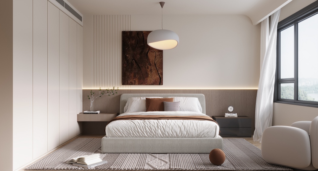 本設(shè)計(jì)主打現(xiàn)代簡(jiǎn)約風(fēng),整體空間以簡(jiǎn)潔的直線條勾勒輪廓,墻面多為素色,搭配質(zhì)感軟裝??蛷d用筒燈、燈帶營(yíng)造溫馨氛圍;開(kāi)放式廚房增強(qiáng)通透感,臥室布置簡(jiǎn)約,注重收納,家具選低飽和度色彩,呈現(xiàn)舒適、時(shí)尚且實(shí)用的居住空間。